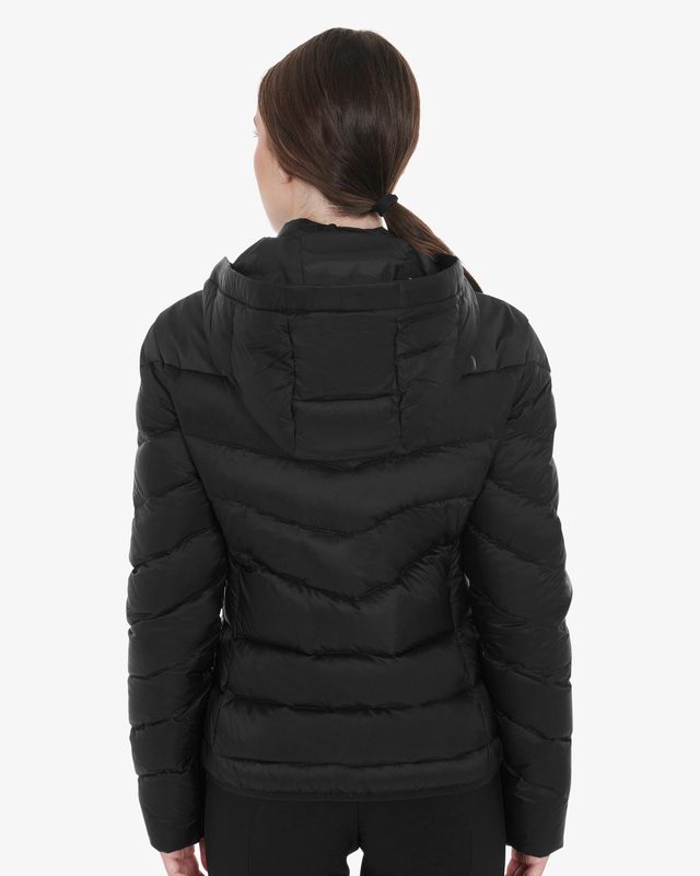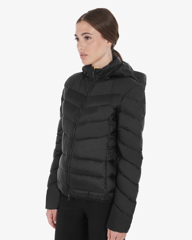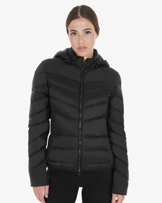 Women’s slim fit down jacket with removable hood and side pockets with zip. The composition makes the garment perfect for the coldest days.